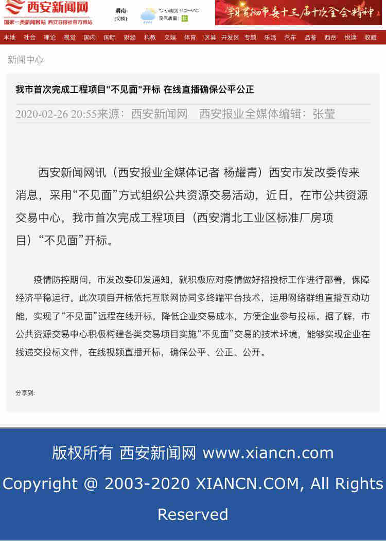 西安市首個”疫期不見面,服務不中斷”工程項目開標